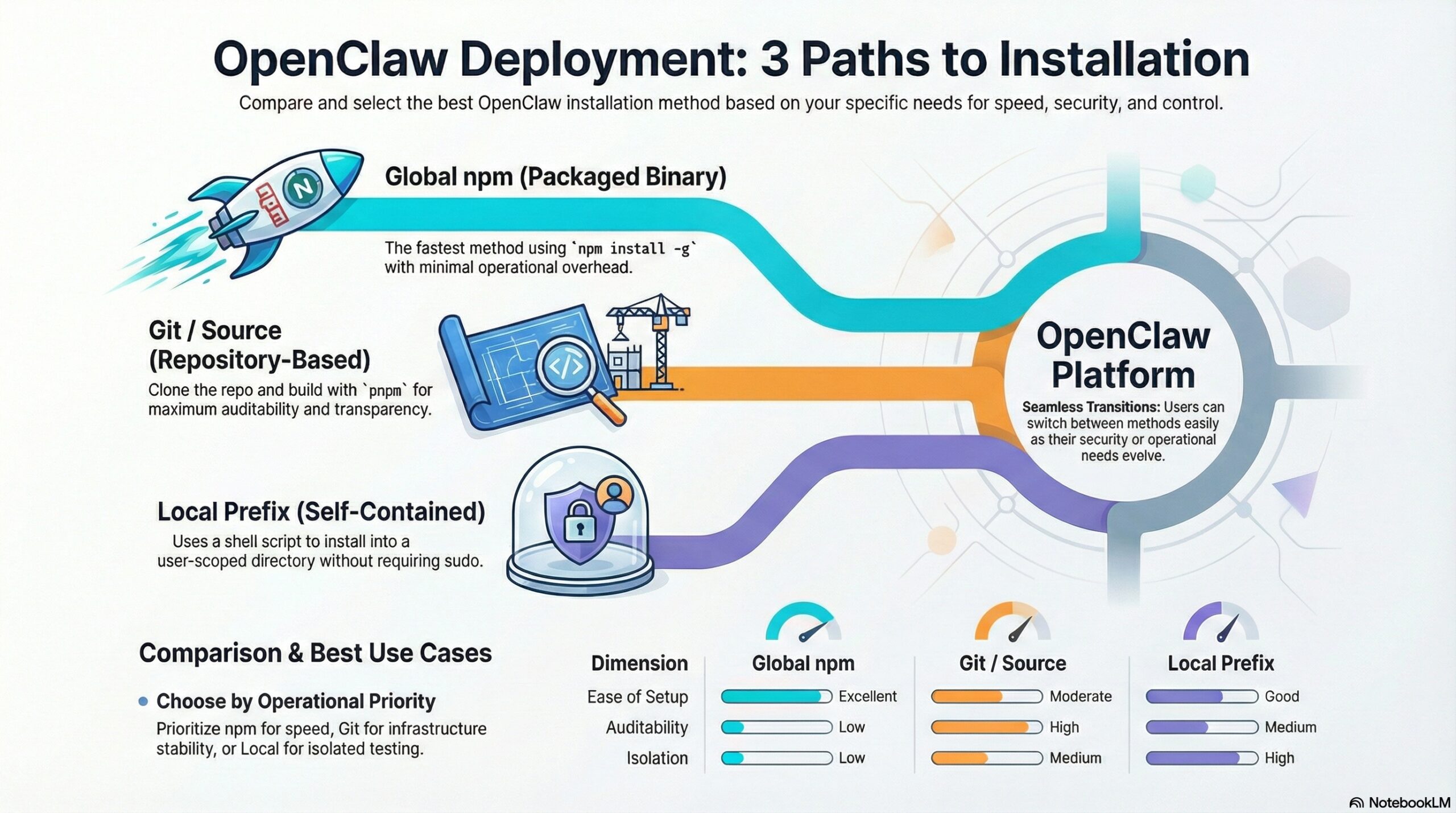 - Choose Git / Source if you care about supply-chain transparency, want deterministic upgrades, or run OpenClaw as long-lived infrastructure where predictability matters more than convenience.
