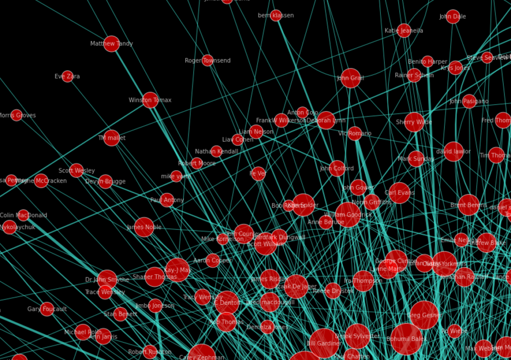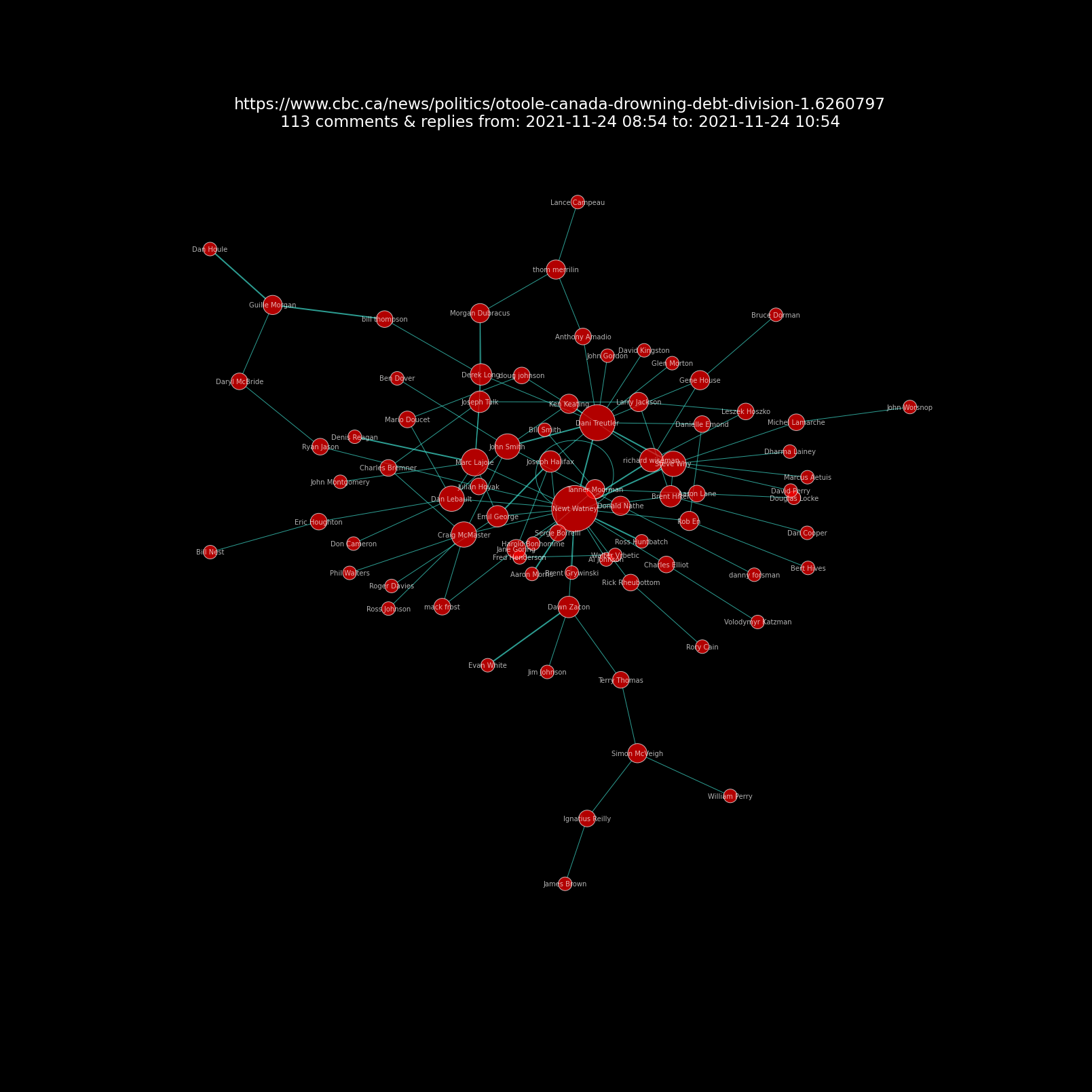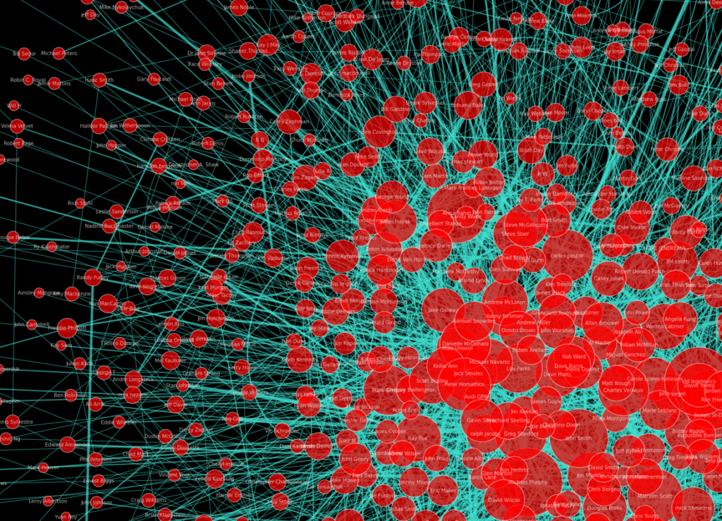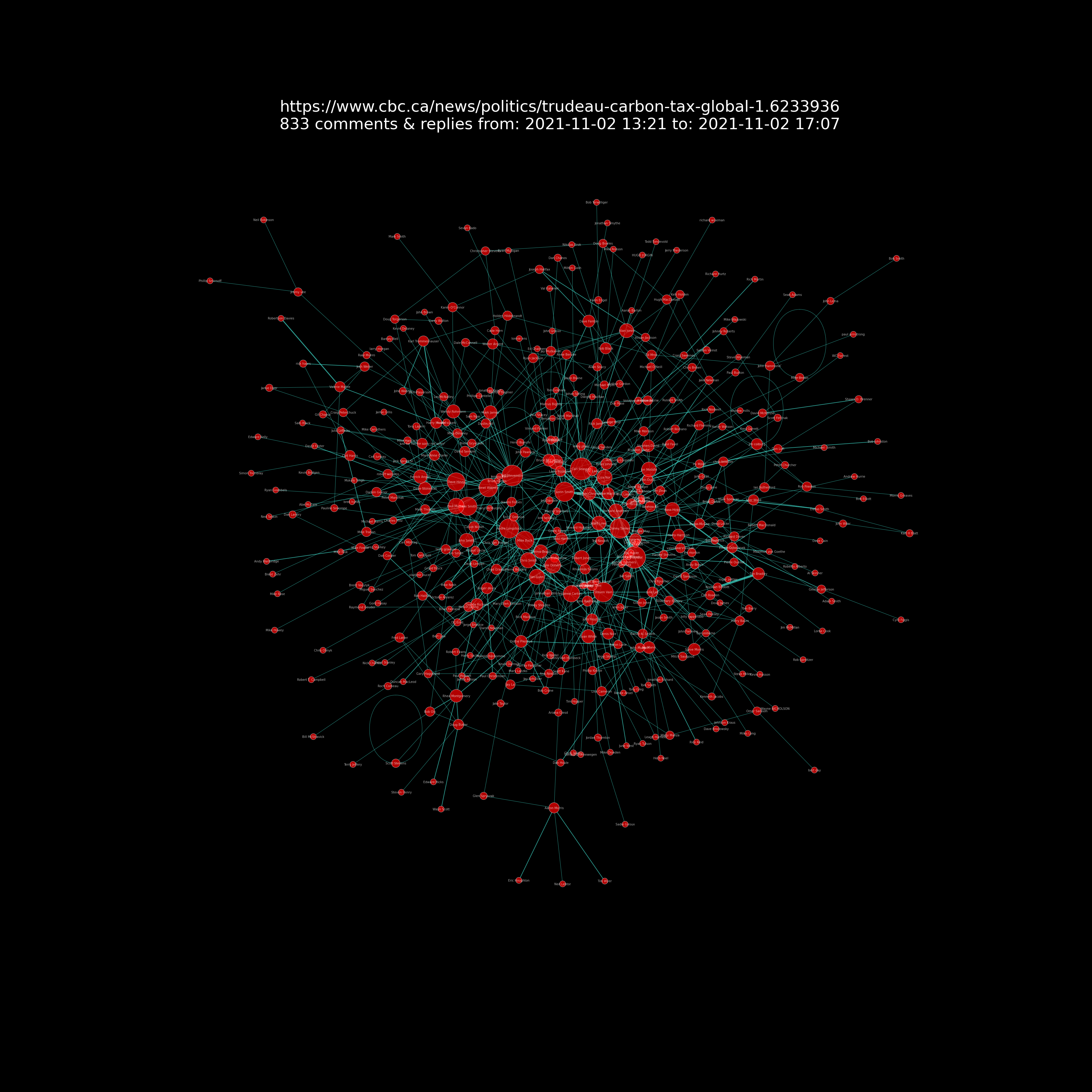 Nodes: The red circles (“nodes”) are users. The red circle size corresponds to user comment counts. If you zoom in on the chart you can also see the commenter’s name in white lettering.