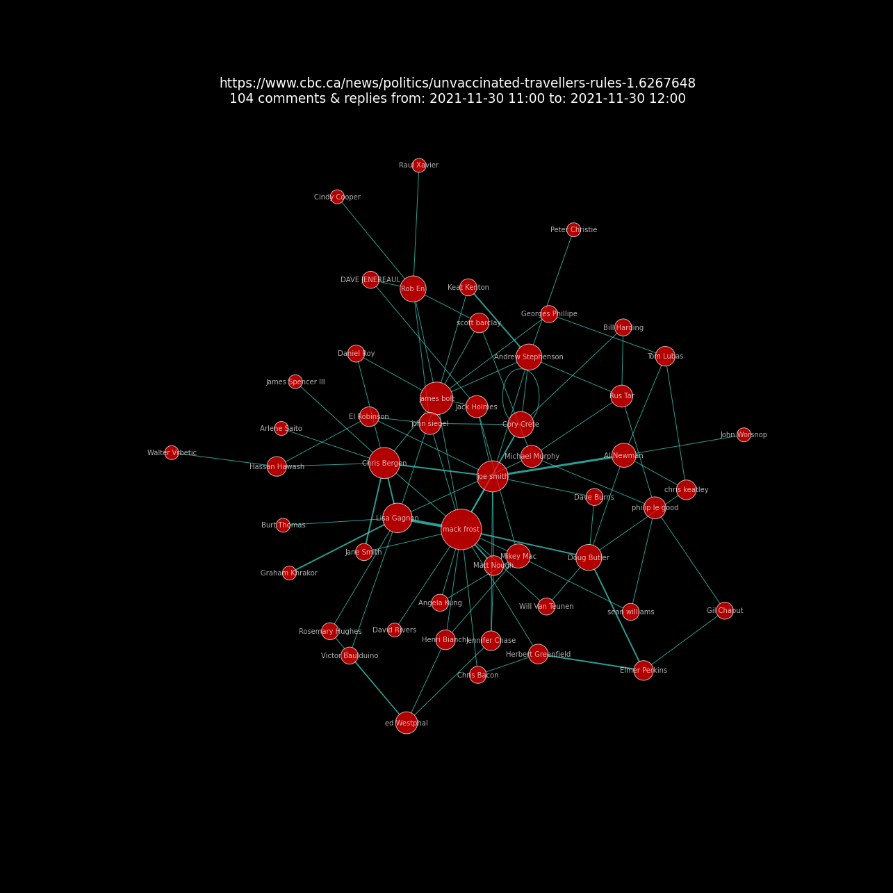 The first network chart below only contains 104 comments and replies on the article Unvaccinated travellers over the age of 12 barred from planes and trains as of today. This provides a very clear simple view of the nodes and lines.