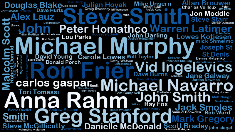 The “word cloud” chart below shows the names of the top 200 users by comment and reply count. The name size corresponds to user comment and reply counts.