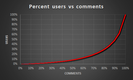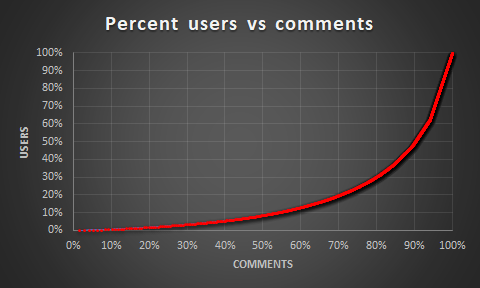 The line chart below shows percent users vs percent comments for a single article. This visualization highlights that about 50% (about 615) of 1,226 users made 90% of the comments. Only 9% (about 105 users) of the users made 50% of the comments!