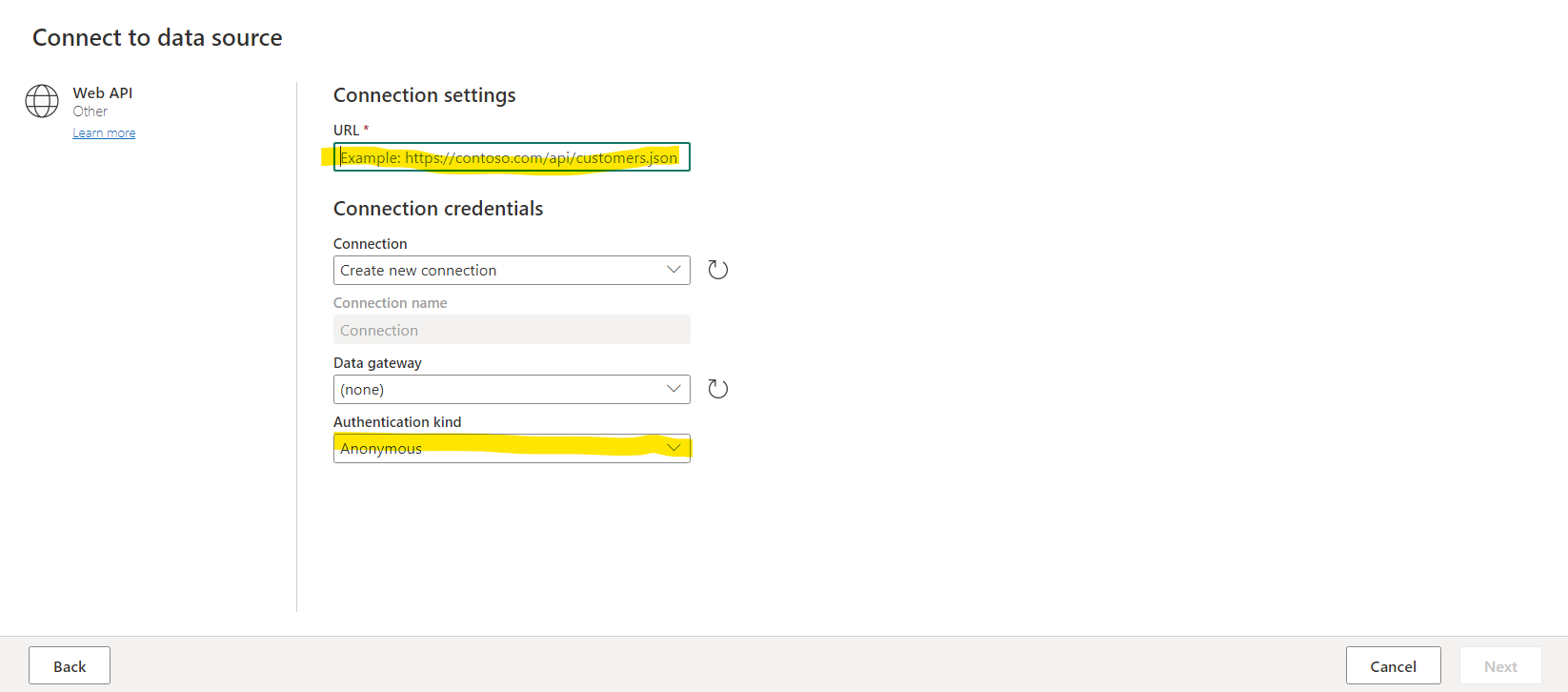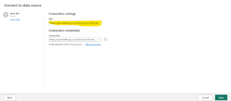 Enter the full hardcoded url eg from my example above. (We will edit the url later to include a dynamic end date.) Then click Next to retrieve the data.