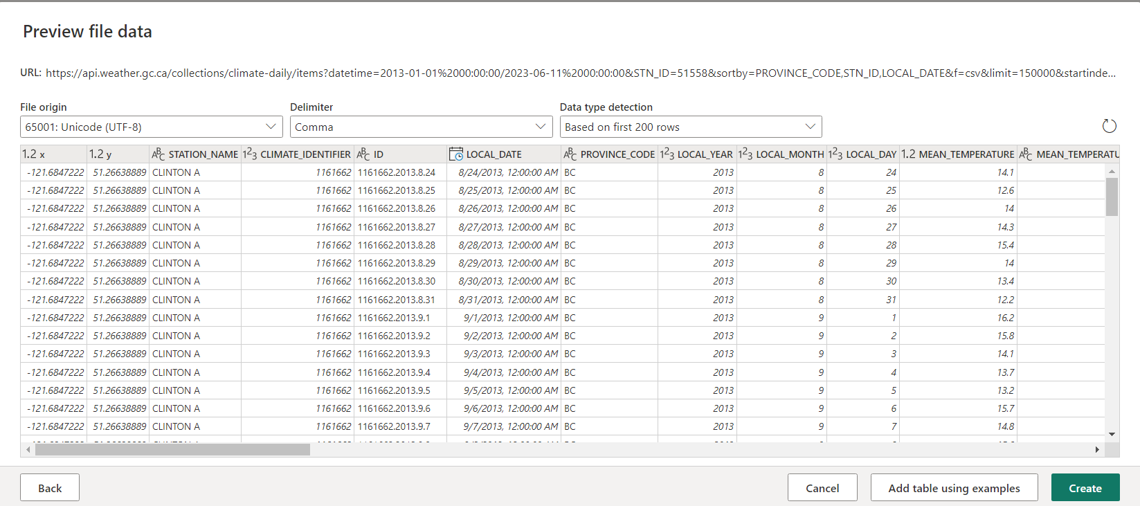 https://api.weather.gc.ca/collections/climate-daily/items?datetime=2013-01-01%2000:00:00/” & Date.ToText(Date.From(DateTime.LocalNow()),”YYYY-MM-DD”) & “%2000:00:00&STN_ID=51558&sortby=PROVINCE_CODE,STN_ID,LOCAL_DATE&f=csv&limit=150000&startindex=0