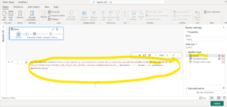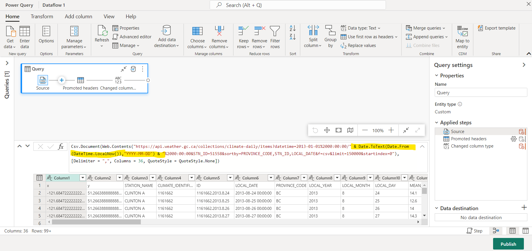 I created a Fabric Dataflow Gen2 Web API connection to retrieve csv file data from an Environment Canada daily environmental data web API.