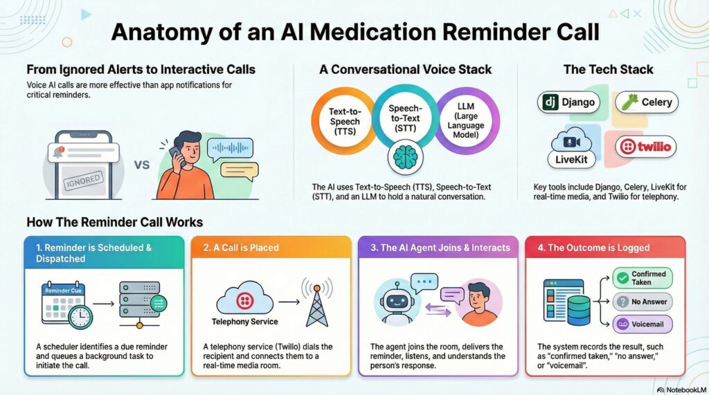 The system allows users to schedule reminders to recipients and then uses a voice AI agent to run the actual phone call. The agent can speak naturally, listen to responses, and adapt the conversation. This is where the “voice stack” comes in: