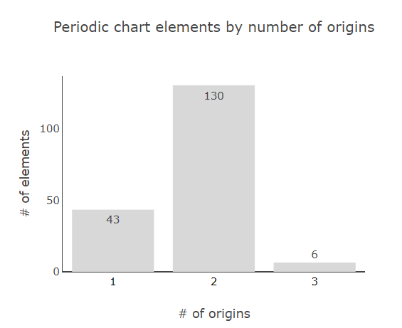 The second chart shows counts of elements by number of source/origin. It was also very interesting to also learn that some elements have more than one source/origin, and 136 elements have more than one source/origin.