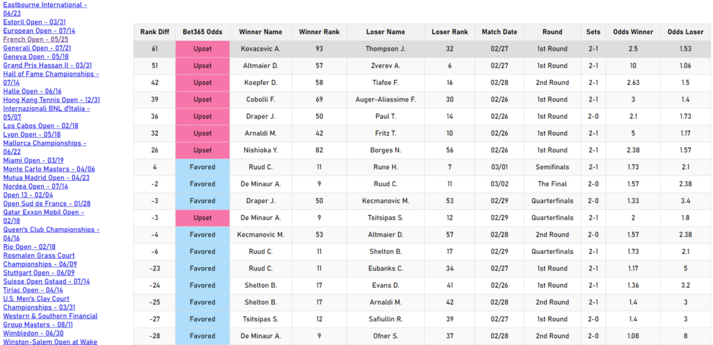 - Data Transformation: The dataset was transformed to calculate the rank differences, and outcomes were categorized based on whether the match resulted in an upset or a favored win.