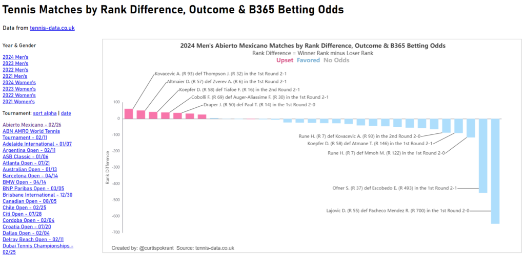 - Pink represents match outcomes that are upsets. Generally this is when lower-ranked players defeat higher-ranked opponents. However, lower ranked players can be favored to win the match and if this doesn’t happen then this will also be an unexpected match outcome.