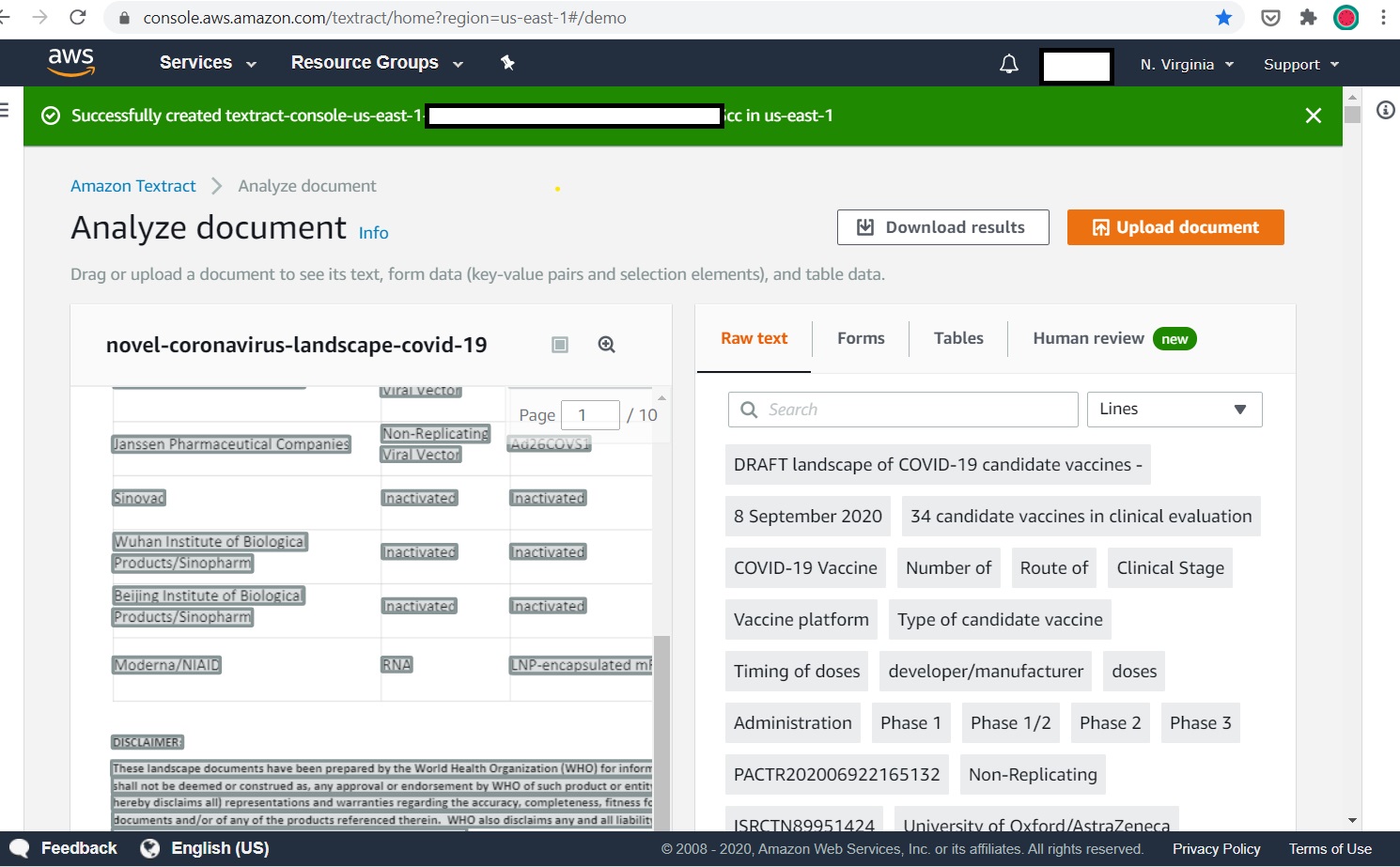 Amazon AWS Textract – WHO “Draft landscape of COVID-19 candidate vaccines” – convert PDF to csv