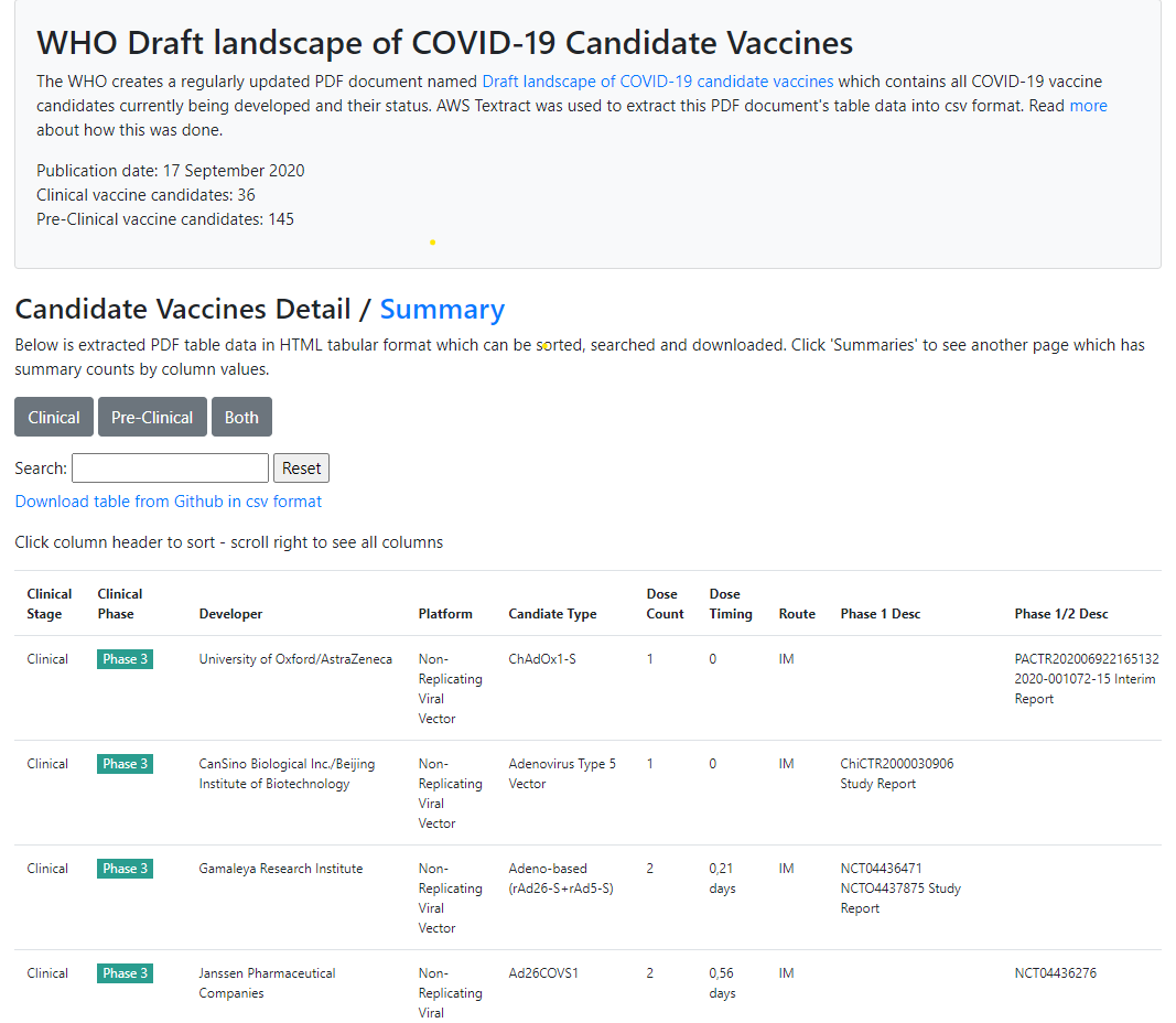 TLDR: I extracted text from the WHO’s vaccine candidate PDF file using AWS Textract and made text into a set of interactive web pages . View the AWS Textract PDF extract output csv files in this Github repository and view and interact with the web pages here.